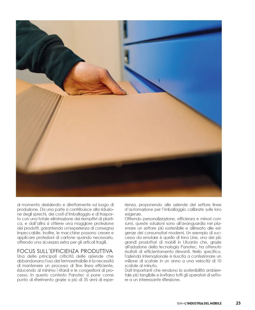 Un esempio di successo da emulare è quello di Inno Line, uno dei più grandi produttori di mobili in Lituania che, grazie all’adozione della tecnologia Panotec, ha ottenuto risultati di efficientamento rilevanti. Nello specifico, l’azienda internazionale è riuscita a confezionare un milione di scatole in un anno a una velocità di 10 scatole al minuto. Dati importanti che rendono la sostenibilità ambientale più tangibile e invitano tutti gli operatori di settore a un interessante riflessione.